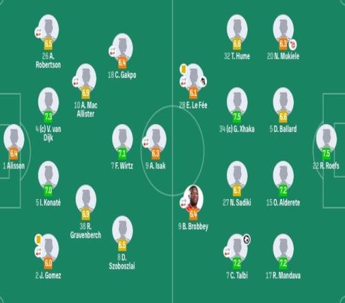 利物浦首發(fā):1-阿利松、2-戈麥斯(65'17-瓊斯)、4-范戴克、5-科納特、26-羅伯遜(86'6-科爾克茲)、7-維爾茨、8-索博斯洛伊、10-麥卡利斯特(74'22-?;倏耍?、38-赫拉芬貝赫、9-伊薩克(86'14-基耶薩)、18-加克波(46'11-薩拉赫)