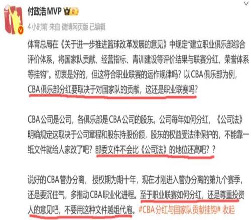 對此媒體人付政浩也發(fā)表了自己的意見:CBA俱樂部分紅要取決于對國家隊的貢獻,這還是職業(yè)聯(lián)賽嗎?說好的CBA管辦分離, 授權期為期十年,現(xiàn)在才剛進入管辦分離的第九個賽季,還是要沉住氣,多推動CBA職業(yè)化進程。至于職業(yè)聯(lián)賽如何分紅,還是尊重投資人的意見吧,不要用這種文件越俎代庖。