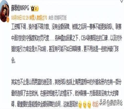 媒體人付政浩曾發(fā)文點(diǎn)評(píng):工資帽下調(diào),換外援不限次數(shù)、沒(méi)有全額保障、被裁之后同一賽季不能更換球隊(duì)、聯(lián)賽中面對(duì)的防守強(qiáng)度和吹罰尺度……各種疊加因素之下,CBA聯(lián)賽現(xiàn)在的口碑,以及對(duì)外援的吸引力肯定是大不如前,甚至有可能不如日韓聯(lián)賽,更不用說(shuō)是一些歐洲豪門球會(huì)。
